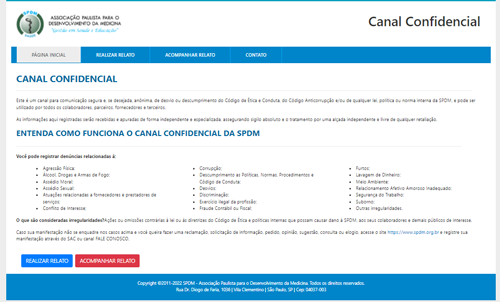 O Canal de Denúncias está disponível em língua portuguesa, podendo ser acessado 24 horas por dia, inclusive de forma anônima, com possibilidade de acompanhamento da denúncia pelos denunciantes e apresentação das informações, conclusões, interrupção e reparação dos danos apurados pela SPDM.